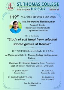 The Open Defence and Viva Voce for the award of the Ph.D. degree to Ms. Keerthana Nandakumar is scheduled to be held on Monday, 13th October 2025, at 10:30 am, in Menachery Hall, St. Thomas College (Autonomous), Thrissur. The title of the thesis is “Study of soil fungi from selected sacred groves of Kerala”.
