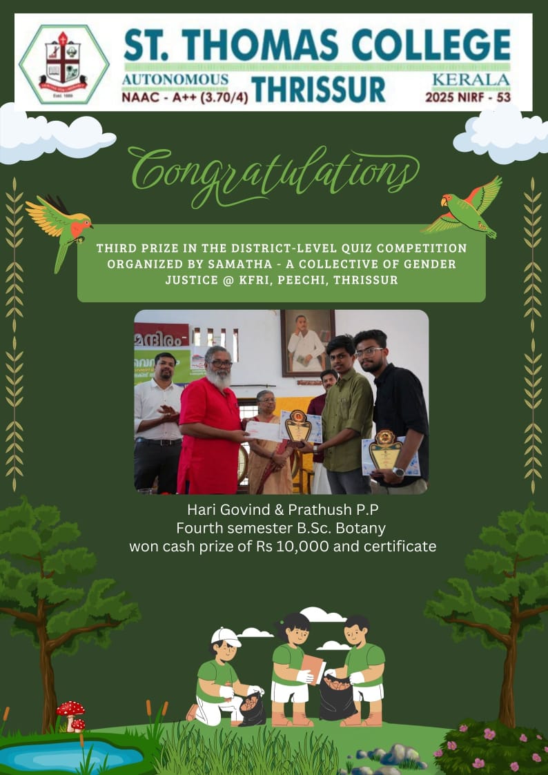 Thomas C.J.2024-02-01T10:08:01+05:30Ph.D. Open Defence and Viva Voce of Ms. Smitha P S, Research Scholar in Botany, St. Thomas College (Autonomous), Thrissur, under the guidance of Dr Ano P V, has held at 10.30 am, on Monday, 30th January 2024. The title of the thesis was “CHARACTERIZATION OF SYZYGIUM TRAVANCORICUM GAMBLE (MYRTACEAE), A CRITICALLY ENDANGERED ENDEMIC SPECIES [...]