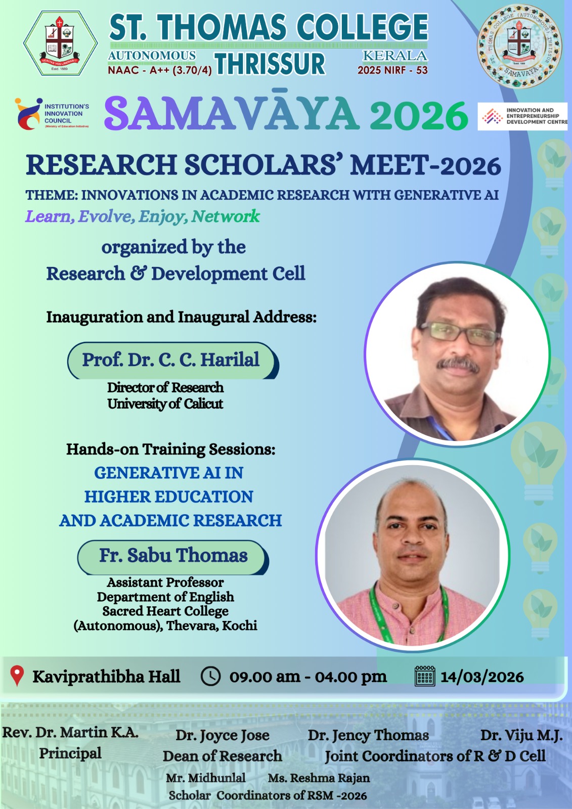 National Seminar on Intersections: Advances in Interdisciplinary Research & Research Scholars’ Meet is inaugurated by Prof. A Jayakrishnan, Former Vice Chancellor, University of Kerala. Manager Mar Tony Neelankavil presided the inaugural function. Executive Manager Rev Fr Biju Panengadan, Dr Martin K A, Principal, Dr V M Chacko (Dean of Research), and Dr Binoy C F(Coordinator) spoke on inaugural session. Santhome Research Awards were presented to the winners. Prof.A.Jayakrishnan delivered the keynote address. Dr Saji T G, Professor, CUSAT, Dr Chacko Jose P, Principal, St.Aloysius College, Elthuruth and Prof. C.Sudarsanakumar, Professor and Former Director (SPAP), MG University, Kottayam delivered invited talks. Full time Science Research students presented their research status. All the sessions were motivative. The seminar will be continued as per schedule.
