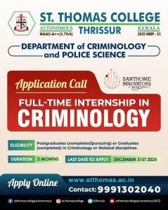St Thomas College (Autonomous), Thrissur, Department of Criminology & Police Science calls for full time Internship in Criminology